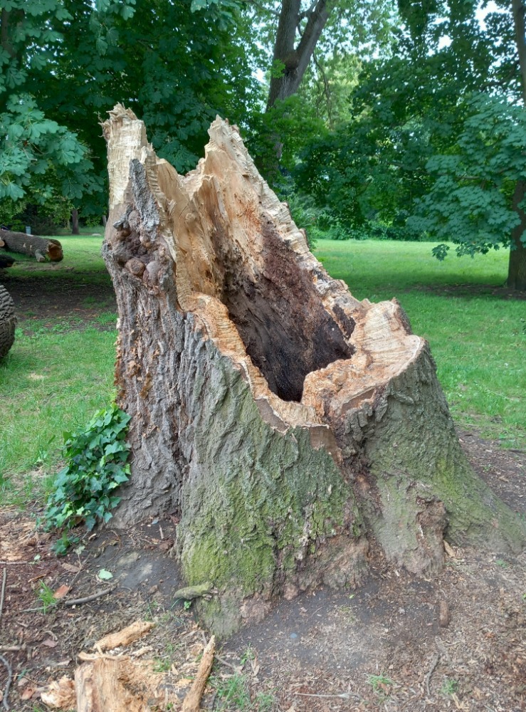 Dne 16. června jsem šla pozorovat život na Zámeckém rybníku. Ztuhnula jsem při pohledu na obrovský starý strom na kraji rybníka, který se zlomil. Na památku a pro hmyz tu bylo ponecháno několik špalků z jeho nejnižších částí. Šla jsem blíže. Strom byl dlouhodobě vyživován stále ztenčující se částí tkáně po obvodu. Silné větry, které i v létě 2025 několikrát vanuly, změnily život tohoto věkovitého stromu. Na zemi jsem již nenašla žádné větvičky s listím. O jaký strom šlo, jsem nemohla zjistit ….. O několik týdnů později. Na boku při zemi strom začal keřovitě obrůstat. Poznala jsem listy jasanu.
