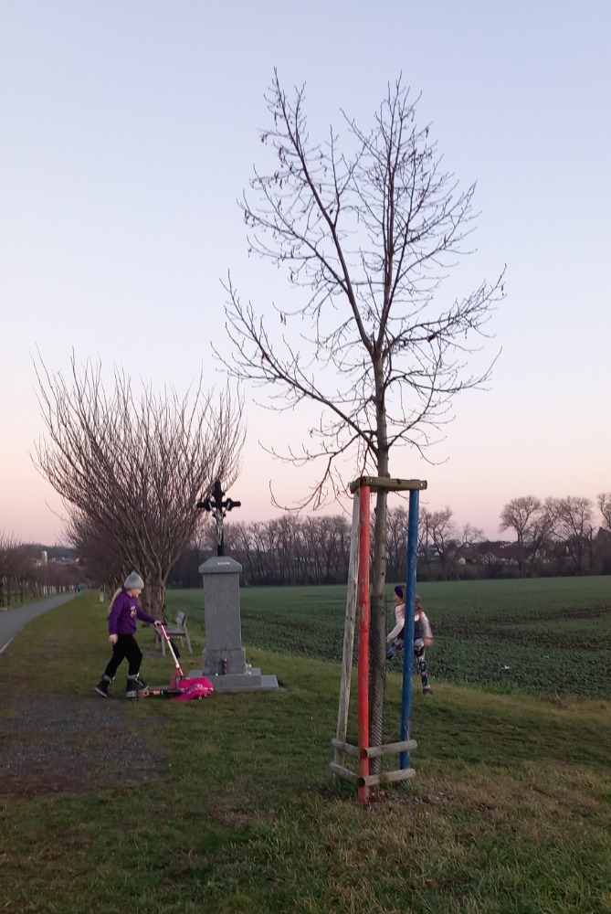 Hod Boží Vánoční roku 2024 byl zalitý slunce. K potoku jsme se vypravila po třetí hodině. Slunce klesalo k obzoru. V těch chvílích má krajina zvláštní atmosféru. Vydala jsem se projít polní cestu mezi Miškovicemi a Třeboradicemi, kterou jsem ještě nepoznala. Ta začíná u mostku přes potok na okraji obce. Na mapě z 19. století je polní desta zakreslena. Dnes je cesta vyasfaltovaná a na katastru Miškovic je osázena po obou stranách na jaře bohatě kvetoucími sakurami. O těchto místech jsem již v kronice podala zprávu i s fotografiemi sakur. Na začátku své cesty jsem u potoka uviděla výstražnou ceduli. Vyfotila jsem ji a pokračovala jsem dál. Cestou jsem potkávala občany, kteří se stejně jako já vydali na sváteční promenádu. Vyfotila jsem si lípu svobody a křížek. Na straně Třeboradic děti slézaly horolezeckou stěnu. Obešla jsem Třeboradický kostelík a zvonici a vrátila jsem se ke svému autu do Miškovic.