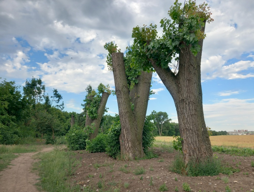 3. čevence 2025 jsem se na místo u mostku vrátila. Hleděla jsem na něco, s čím jsem se v životě nesetkala. Přináším fotografie. Když znovu a znovu prohlížím jeden ze snímků, mám pocit, jako bych byla v divadle a vnímala kulisu hrůzného děje. Dendrologové však zkrácení stromů čakovické radnici doporučili / Miškovice jsou ve správě Čakovic/. Proč? Částečnou odpověď mi dal můj známý truhlář. Jsou stromy, které ze své přirozenosti mají dřevo, které brzo podléhá rozkladu od středu kmene. Jsou to topoly a jasany. Ořezané části stromů byly z místa ořezu topolů již odvezeny. V jedno místě jsem však našla zapomenutou hromádku špalků, která mi doložila, že je tomu tak. Důvody zkracování patrně zdravých stromů zatím neznám. Místostarostka Čakovic Soňa Černá nadále pokračuje v péči o stromy katastru. Každý rok objevím nějakou úpravu. Poblíž podél potoka směrem k Miškovicím byly nově vysazeny stromy. Poznala jsem lípu, javor mleč a duby. Ty podesychaly. Václav Cílek , který se zabývá adaptací přírody na klimatickou změnu, říká, že je doporučeno sázet více druhů stromů. Vývoj určí, které stromy v oteplující se krajině obstojí.