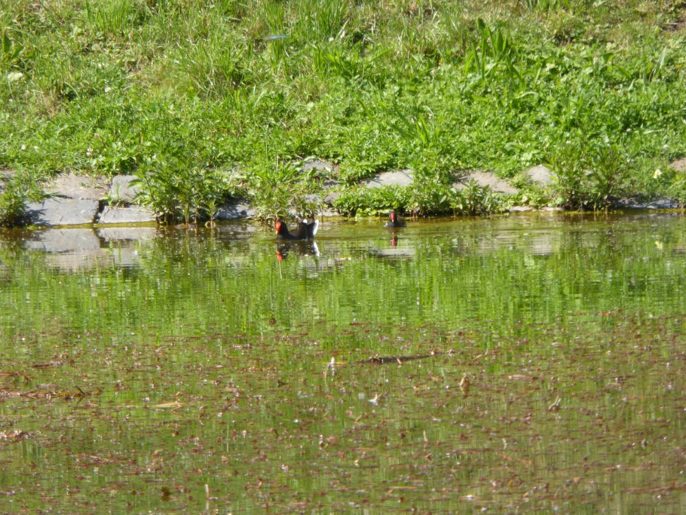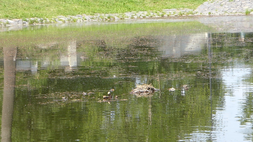 Co se odehrálo na hladině Zámeckého rybníka dne 15. června roku 2025? Na hladině pluly dvě silné větve, které tam byly ponechány vodnímu ptactvu poté, co se zlomil staletý jasan a spadl na hladinu. Na fotografii vám představuji párek slípek zelenonohých, který pocítil potřebu zahnízdit na jedné z nich. Silná větev se nacházela v polovině rybníka.