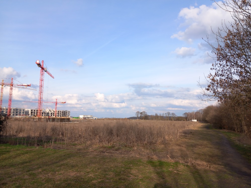 Za Lidlem, dál po toku potoka směrem k Miškovicím, probíhal v roce 2025 v polích geologický průzkum. Letos už se tu staví sídliště. U kávy a dortu v Globusu jsem si povídala s paní bydlící u Lidlu vedle Zámeckého rybníka. Nové sídliště nabídne několik set bytů…