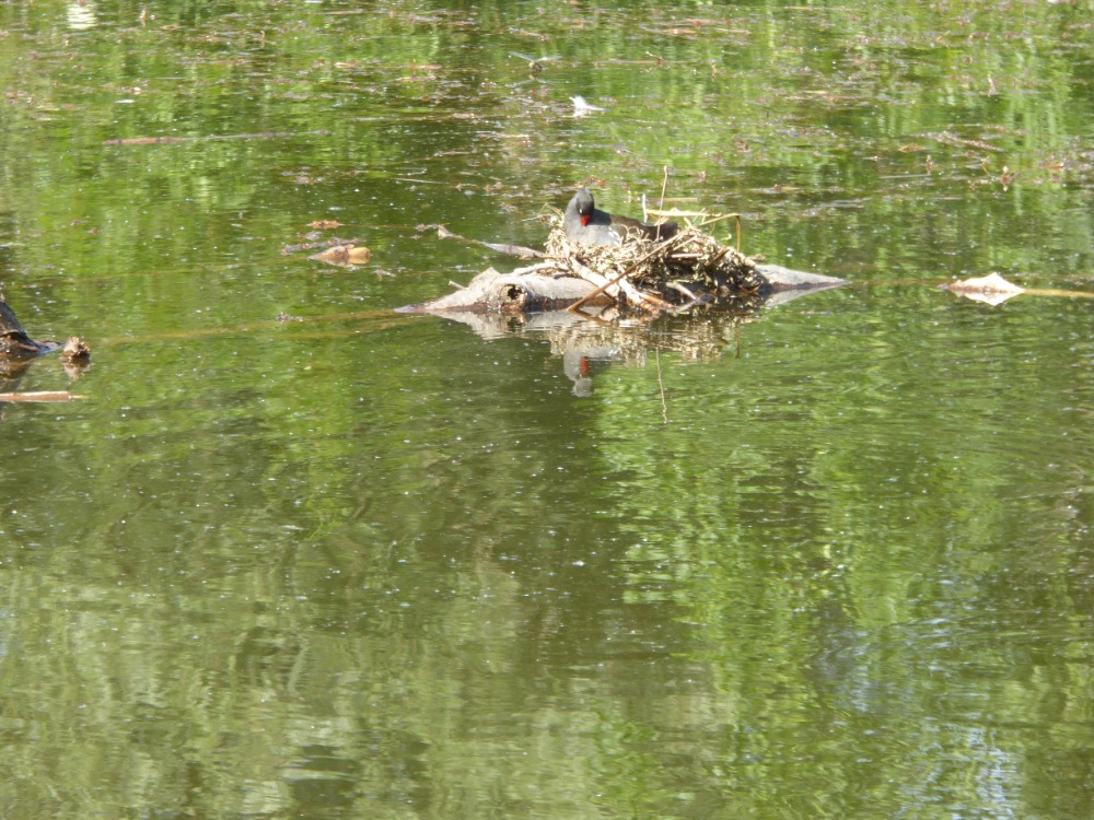 Další den jsem byla u rybníka zpět. Nová příležitost pozorovat hnízdění, vyvedení mláďat – to si nechci nechat ujít. Na kmeni již bylo připravené hnízdo! Pár slípek volně křižoval hladinu a pak… dočkala jsem se. Samička usedla do hnízda.