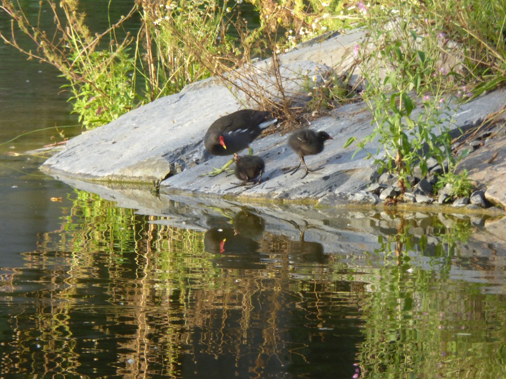 Ve žhavém letním dni jsem znovu k rybníku přišla. Podařilo se mi vyfotit život slepičí rodiny se šesti mláďaty. Na fotografii jsou čtyři. Jak okomentovat vývoj? „Pár operativně zahnízdil na ostrově.“