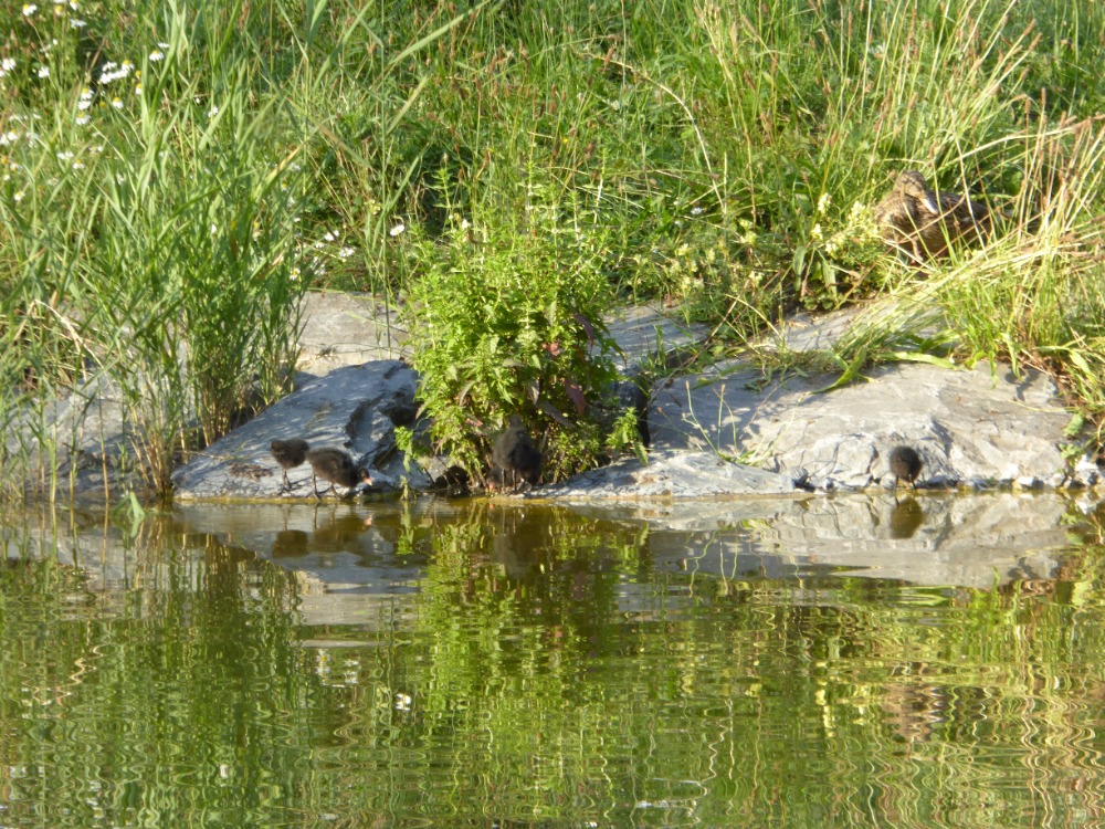 Během dalších dnů jsem udělala záběry, které mi dělají velkou radost. Viděla jsem rodiče krmit kuřata plovoucí na hladině. Pozorovala jsem kuře, které se velmi snažilo doplavat k rodiči a sourozencům. První hodiny na hladině, hlad a strach z osiření! Mám v mysli jemné volání rodiče svolávající děti k sobě. Poznám již dospělé slípky po hlase, i když je nevidím.