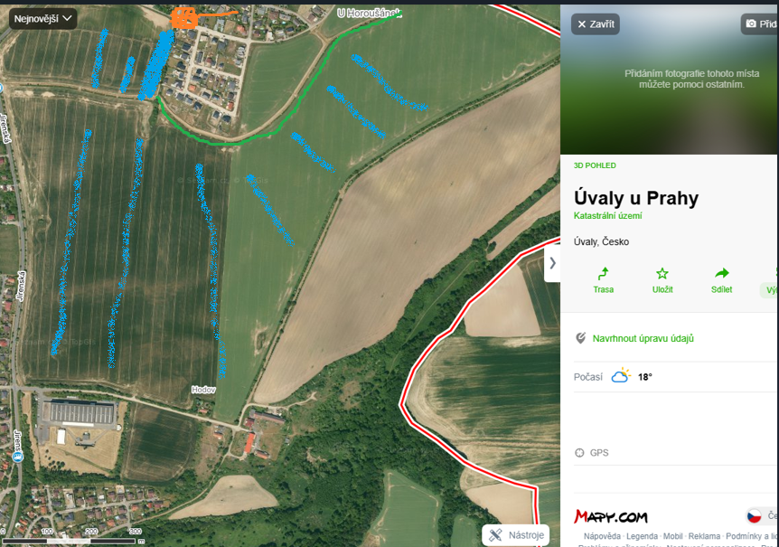V Úvalech u Prahy se podařilo v polích směrem k Horoušánkám s dešťovou vodou pracovat. Dešťovku zachycuje a odvádí příkop. Vznikla zde cyklostezka – vyznačila jsem zeleně. Červeně je vyznačeno místo, kde od podzimu stojí voda, když v zimě mrzne, bruslí se. Od jara do podzimu se tu hospodaří. Letos na jaře zde byla vyseta pšenice.
